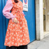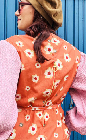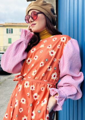 Morbido e dalla linea sciancrata l’abito con taglio sopra la vita e cintura sottile per stringere, tasche sui fianchi e maniche bombate in tessuto elastico goffrato. Sfoderato.