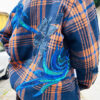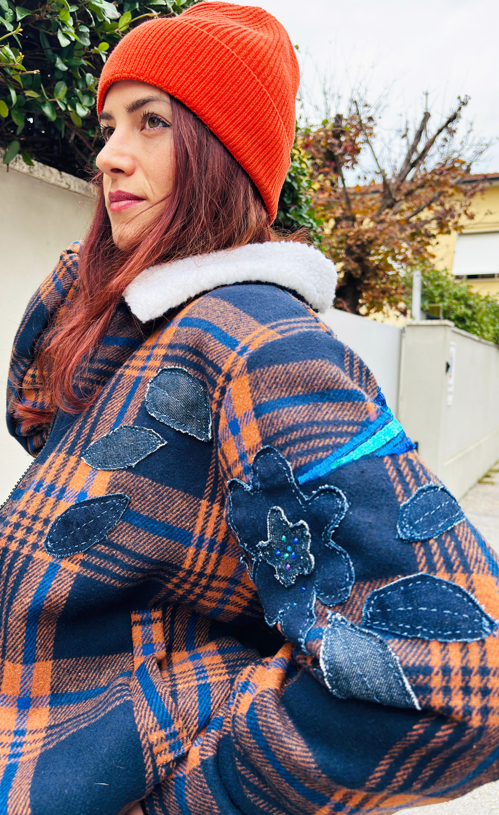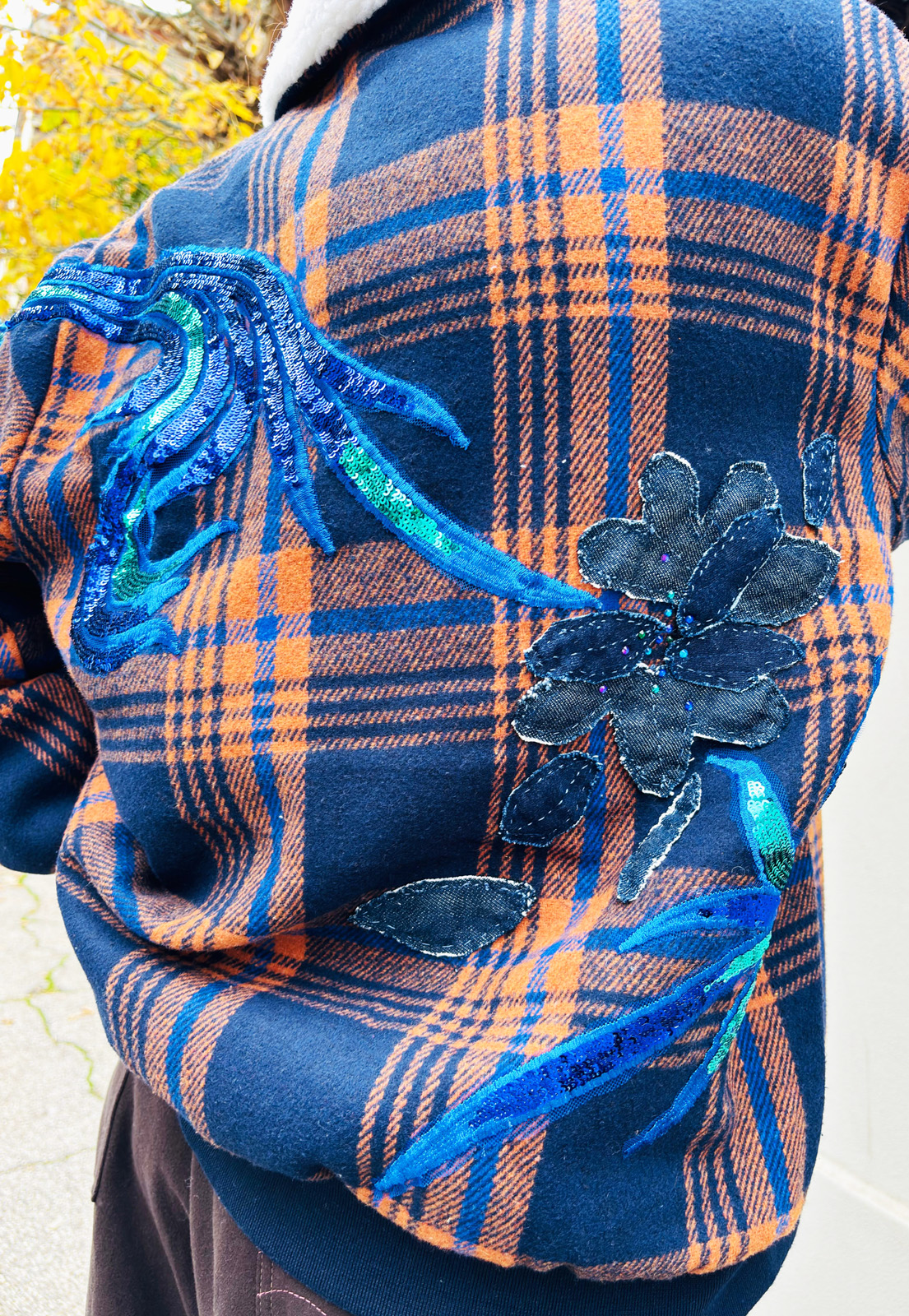 Giubbotto Remake con imbottitura ed ecopelliccia, zip davanti e polsini in maglia. Applicazioni in paillettes e in denim completamente cucite a mano.