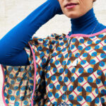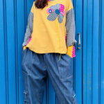 Cardigan in felpa leggera Used su cui abbiamo operato modifiche inserendo dettagli in felpa stampata con nostro pattern personalizzato, passamanerie sulle spalle e applicazione ricamata sul dietro. Vestibilità taglia 40.