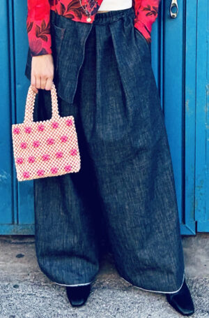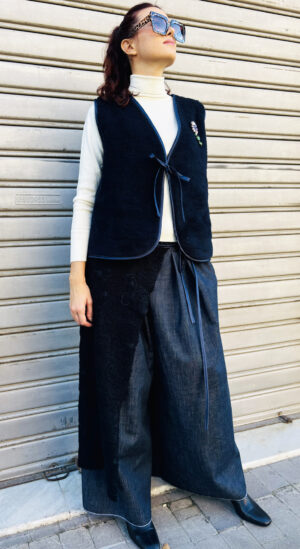 Ampio pantalone in denim blu con tasche laterali e pieghe davanti. Elastico fasciato in vita e ‘grembiule’ in pizzo di lana blu scuro con nastro da annodare sui fianchi.