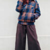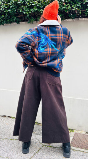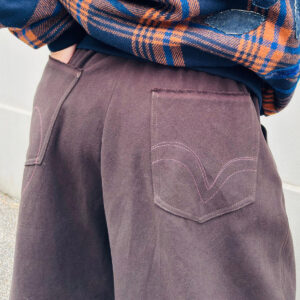 Morbido pantalone in denim nero con tasche con ricamo ‘Cuore’ e al fondo ‘Orlo Cimosa’, elastico in vita bicolore con filato lurex.